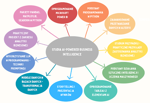 Studia podyplomowe AI-Powered Business Intelligence mają na celu zbudowanie kompetencji w zakresie: